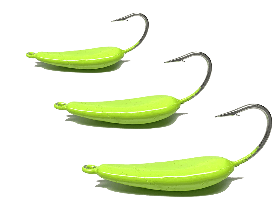 The chartreuse pompano jigs are the ultimate goofy jigs that pompano can not resist. The shape if these jigs creates such a great movement on the bottom when dragged a long on the bottom. It will have pompano think they are chasing an actual sand flea. All of our pompano jigs come in 1/4oz, 3/8oz, 1/2oz, 3/4oz and 1oz. At Hunting and Fishing Depot we sell them in packs of 3. Our 1oz packs come in packs of 2. We have done years of testing to come up with the best colors for catching pompano. We have found that the chartreuse color really attracts them. When the pompano sees it, it will strike almost every time. We know the best color to catch pompano with is chartreuse. Get your jigs today and fill your cooler with more pompano!
